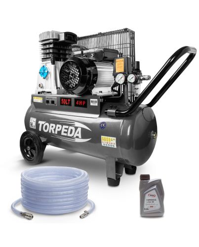 Kompresor Torpeda z indukcyjnym silnikiem 3kW został wyposażony w 2 tłoki i butlę o pojemności 50 litrów.